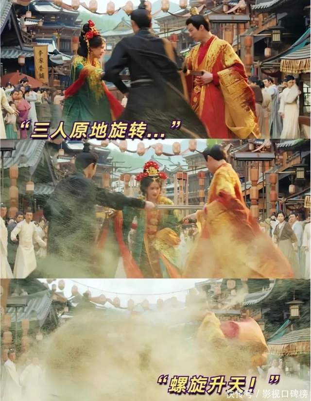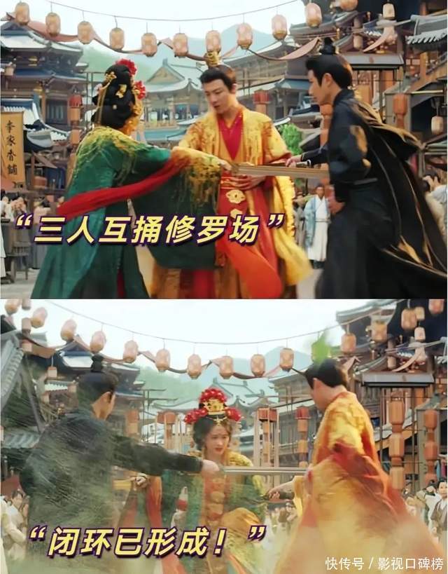 怀疑是不是国内的古装偶像剧卷得太夸张,实在是想不到有什么好的开场。当观众点开《书卷一梦》的第一集,BGM是下沉市场二创剪辑喜欢用的唢呐神曲《囍》。男女主角穿着大红大绿,正要拜堂男二穿着一袭黑衣前来抢亲。红绿黑,三个人因为剪不断理还乱的情感纠葛,你捅她他捅她她捅他,站在十字路口中央万人围观。